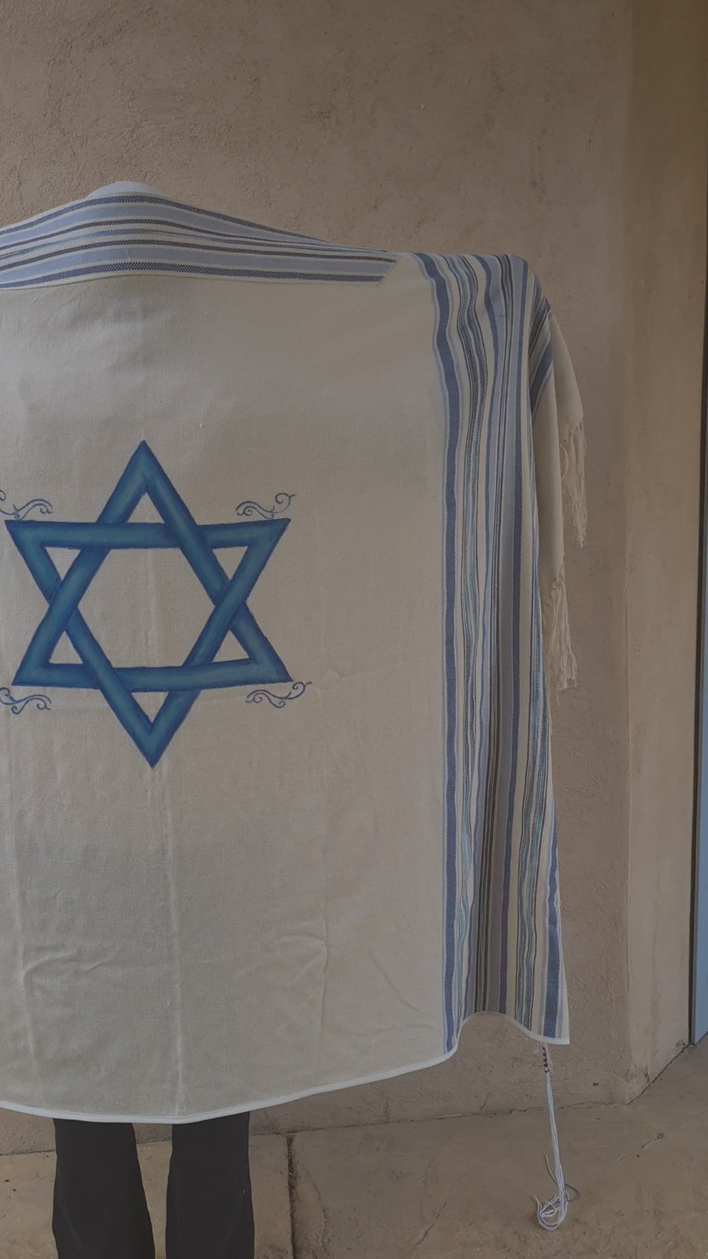 This design is called Star of David tallit and is a combination of light blue, blue, and white. The tallit is handwoven from fine cotton on traditional looms by Jewish men in Israel.